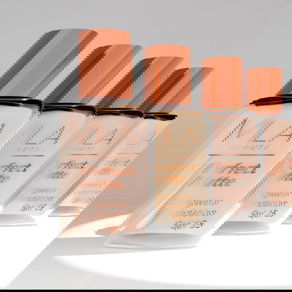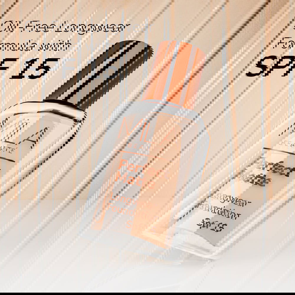 • Mila Perfect Matte Foundation – SPF 15, Water-Resistant, Long Wear