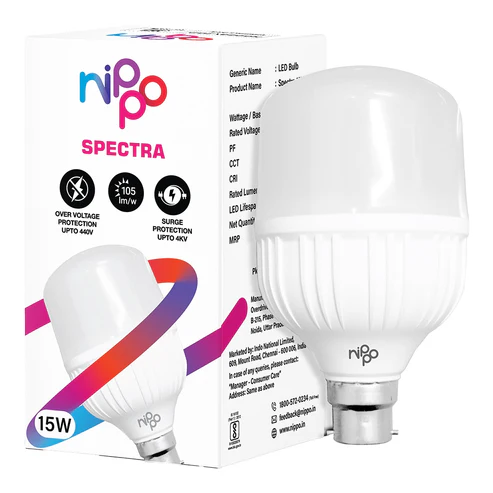 Nippo Spectra LED Bulb 15W with a standard B22 base, this bulb fits most Indian household sockets, making installation a breeze. At just 49 grams, it’s lightweight, long-lasting, and an excellent choice for energy-efficient living. Perfect for homes, offices, study areas, shops, or showrooms.
